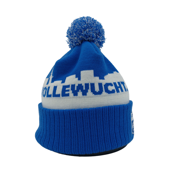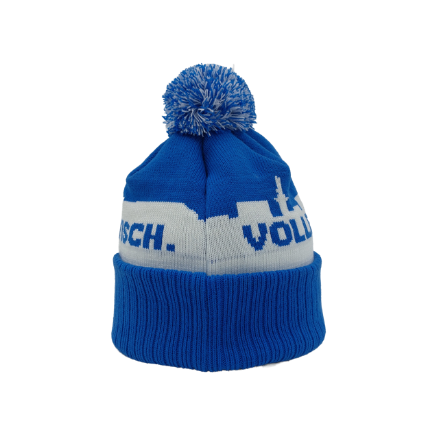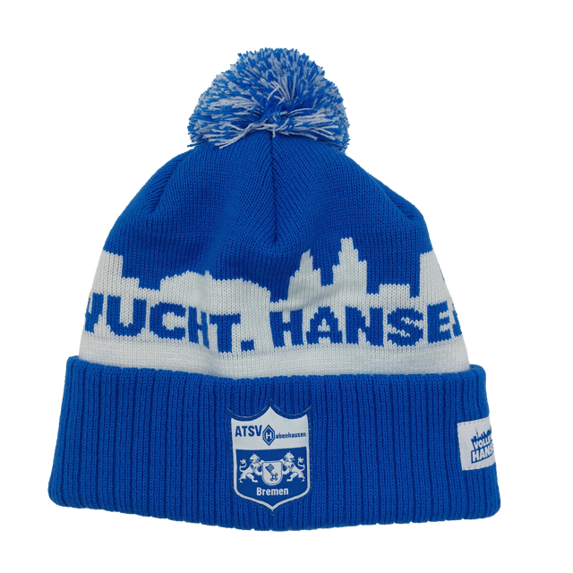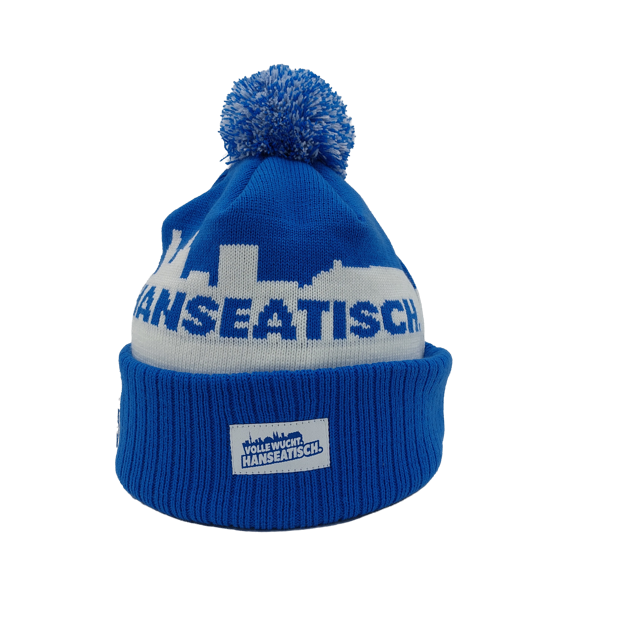 Die blau-weiße Strickmütze präsentiert sich im klassischen Vereinsdesign, inklusive markantem Skyline-Muster und dem eingearbeiteten Schriftzug. Der große Bommel sorgt für einen sportlich-modernen Look, während der breite, umgeschlagene Bund mit dem offiziellen Volle Wucht Hanseatisch Logo veredelt ist.